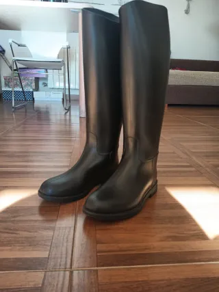 Botas de equitación de color negro, talla 36/37. Perfectas para la práctica de la equitación. - Material: Cuero sintético. - Altura: Hasta la rodilla.