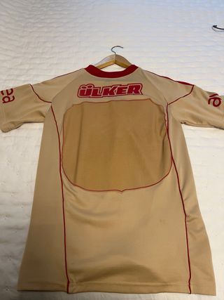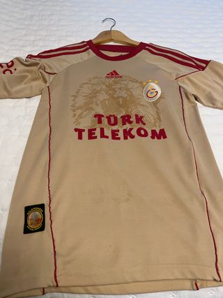 Camiseta de fútbol del Galatasaray con patrocinio de Turk Telekom. Diseño con león y detalles de Adidas. Talla M Precio algo negociable - Color principal beige. - Mangas largas con detalles rojos. - Escudo del club y logo de Adidas visibles.