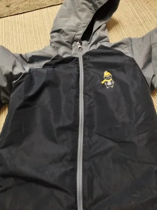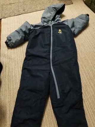 Buzo de esquí para niño, ideal para mantenerse abrigado y seco en la nieve. Diseño bicolor en azul marino y gris. - Capucha integrada. - Cierre frontal con cremallera. - Mangas y cintura elásticas. - Talla 3/4 104cm