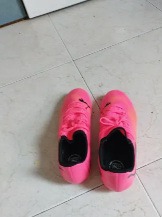 Zapatos de fútbol Puma en color rosa vibrante, talla 36. - Diseño deportivo. - Cordones rosa - Suela con tacos.