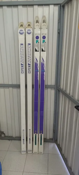 Conjunto de esquís de la marca Rossignol. Son antiguos pero están sin usar, no llevan fijaciones. El precio es para cada par - Diseño blanco con detalles en morado. - Logotipo de Rossignol visible.