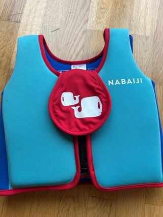 Chaleco de natación para niños de la marca Nabaiji. Diseño divertido con ballenas. - Color azul y rojo. - Cierre de cremallera. - Estampado de ballenas en blanco. usado una vez