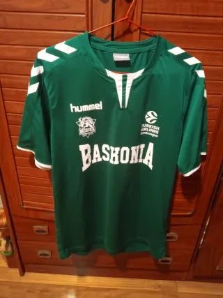 Camiseta oficial del Baskonia de la marca Hummel. - Color verde. - Talla L. - Diseño con detalles blancos en cuello y mangas. - Logo de Hummel en el pecho. - Escudo del Baskonia. - Logo de Turkish Airlines EuroLeague.
