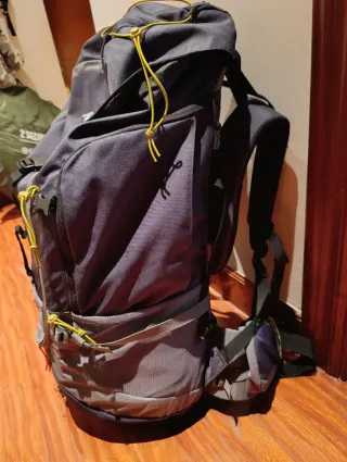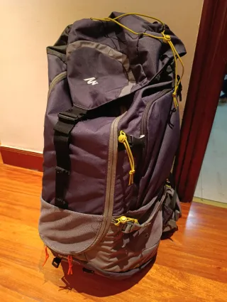 Mochila de montaña Quechua con gran capacidad. - Color azul marino y gris. - Cierre superior con cordón ajustable. - Bolsillos laterales de malla. - Correas de hombro acolchadas. Usada una sola vez. Tengo dos unidades, las dos juntas serían 90€