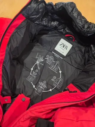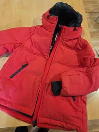 Chaqueta de esquí de color rojo, ideal para actividades al aire libre. - Capucha ajustable. - Cremallera frontal. - Bolsillos con cremallera.
