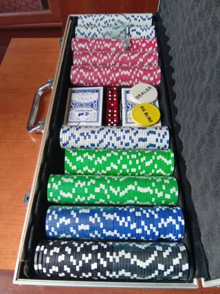 Maletín de póker con todos sus accesorios. - Fichas de póker de varios colores. - Dos barajas de cartas. - Dados rojos. - Fichas de Dealer y Big Blind.