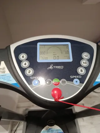 Cinta de correr y caminar de la marca TREO FITNESS. Ideal para entrenar en casa. - Panel de control con pantalla digital. - Botones de acceso rápido para velocidad. - Parada de emergencia con cordón de seguridad.