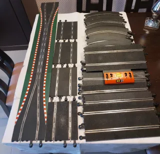 Conjunto de pistas y accesorios para Scalextric. Incluye varios tramos de pista, curvas y rectas. Protecciones de curva. Precio 45 todo o mejor oferta. - Tramos de pista rectos y curvos. - Mandos para controlar los coches. - Transformador de corriente.