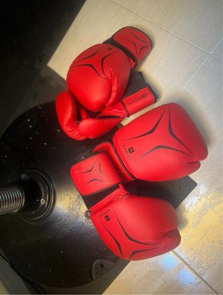 Punching de boxeo con base y regalo 4 guantes de 12 y 6 oz - Punching de boxeo negro. - Base negra. - Incluye cuatro guantes de boxeo rojos.