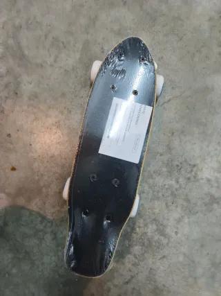 Monopatín con cubierta negra y ruedas blancas. - Cubierta de madera. - Ruedas de poliuretano.