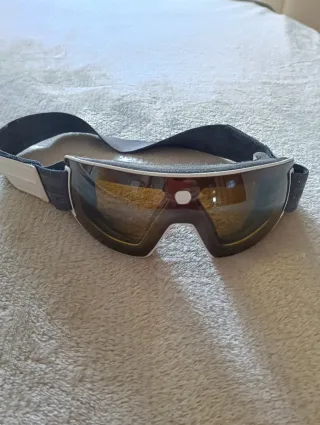 Gafas de esquí con montura blanca y lentes oscuras. Diseñadas para proteger tus ojos en la nieve. - Montura de plástico blanco. - Acolchado interior de espuma negra. - Lentes tintadas.