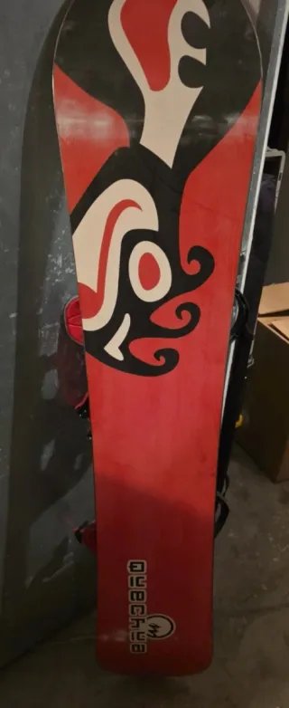 Tabla de snowboard con un diseño llamativo en rojo, negro y blanco. - Parte superior con gráficos abstractos. - Base roja con logo. - Fijaciones incluidas.