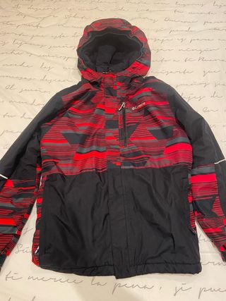 Chaqueta de esquí Columbia para niño, con un diseño llamativo en rojo y negro. - Diseño a rayas en la parte superior. - Parte inferior y mangas en negro. - Capucha integrada.
