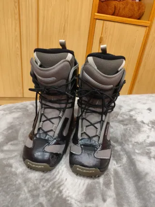 Botas de snowboard Salomon en color gris y negro. Cuentan con un sistema de lazada. - Marca: Salomon - Color: Gris y negro - Cierre: Lazada - tienen pelado la parte de la piel , pero ha sido por no usarlas y tenerlas guardadas. No afecta para nada a la bota. Las suelas están perfectas y lo que es el material de la bota igual