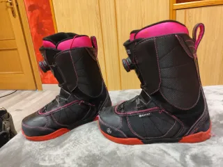 Botas de snowboard K2 en color negro con detalles en rosa. Cuentan con un sistema de cierre BOA. - Cierre BOA. - Interior acolchado. - Suela de goma. -la suela en la parte del talón tiene bastante desgaste. Pero para iniciarse en el Snowboard están aceptables.