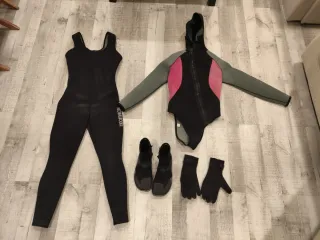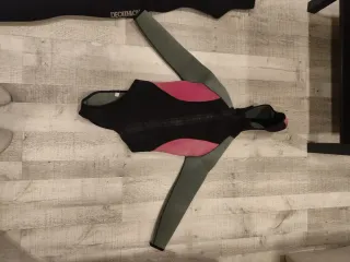 Conjunto de neopreno de 5 mm para actividades acuáticas. Incluye traje completo, escarpines y guantes. Vendo por separado también. Consultar mi perfil. - Traje de neopreno negro con detalles en rosa y gris, tiene un pequeño corte en la parte trasera de la pierna, pero no afecta al traje, no entra agua. Talla XS - Cremallera frontal. - Capucha integrada. - Escarpines negros Olaian. Talla 39-40 nuevos, puesto dos horas - Guantes negros. Talla S Amazon, nuevos puestos dos horas