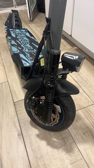 Patinete eléctrico Smartgyro Rockway con un diseño llamativo. - Plataforma con diseño Red Bull. - Manillar gris con logo Smartgyro. - Rueda delantera con suspensión y freno de disco.