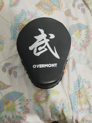 Manoplas de entrenamiento marca Overmont. Diseñadas para la práctica de deportes de combate. - Color negro. - Con un símbolo en blanco. - Material resistente.