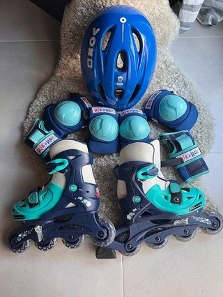 Conjunto de patines en línea, casco y protectores para niños y niñas - Patines ajustables en talla 28-32. - Casco y protectores de color azul. Talla ajustable de la 28 a la 32 para ir creciendo aprendiendo a patinar. Tienen poco uso.