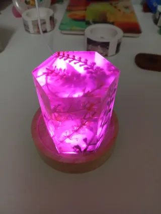 Lámpara decorativa con forma hexagonal, elaborada en resina epoxi transparente. Su diseño único y el brillo de la luz crean un ambiente acogedor. - Material: Resina epoxi. - Forma: Hexagonal. - Acabado: Transparente.