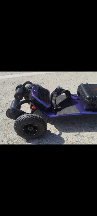 Longboard eléctrico. Medida grande Tiene ruedas de con taco puede ir por asfalto y caminos de tierra Tiene instalado un refrigerador de temperatura y pantalla con indicador de carga en la parte inferior Doble motor trasero Autonomía de unos 40 km según la velocidad Tiene varios modos de uso en modo race se va a unos 40 km/h Tiene marcha delantera y reversa que se ajusta desde el mismo mando, el mando se carga por usb No es un juguete!