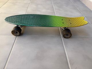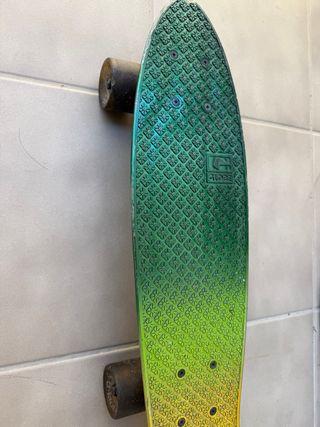 Tabla Penny de la marca Globe con un degradado de colores verde a dorado. Su superficie texturizada ofrece un buen agarre.