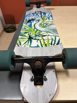 Longboard de la marca Long Island, 110cm largo, con un diseño llamativo. - Tabla con estampado de ave y vegetación. - Ruedas de color verde.