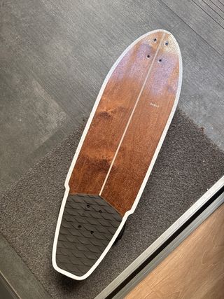 Surfskate Oxelo con diseño inspirado en el longboard. - Tabla con acabado en madera y detalles en blanco y estampado de flores hawaianas. - Logo de Oxelo visible en la tabla. -Usado un par de veces e ideal para iniciarse al Surfing o practicar en tierra cuando no hay olas. -Precio negociable