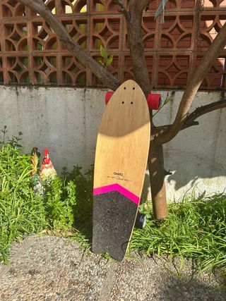 Longboard Oxelo del año 2016, en excelente estado. - Diseño de madera natural. - Base con lija negra y detalles en rosa. - Ruedas rojas y negras.