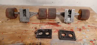 Conjunto de ejes y ruedas para longboard. - Dos ejes de metal plateado. - Cuatro ruedas de color rojizo/marrón. - Dos bases negras para los ejes. Ruedas de 70mm con rodamientos abec7 nuevos. Ejes de 180mm. Sin tornillos..