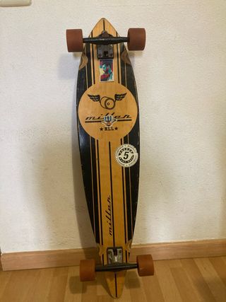 Longboard de la marca Miller con un diseño clásico y llamativo. - Tabla de madera con franjas verticales. - Ruedas de color marrón. - Trucks metálicos.