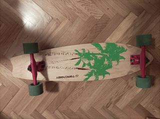 Longboard con un diseño llamativo y original. - Tabla con estampado de flores y pájaros. - Base de madera con acabado brillante. - Ruedas en perfecto estado - Pequeñas marcas de uso como aparecen en las fotos