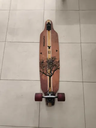 Longboard de la marca Tijuana con un diseño artístico. - Le faltan las ruedas delanteras. - Diseño de árbol y pájaros. - Tonos marrones y rojizos. - Ruedas rojas.