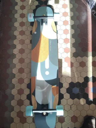 Longboard en buen estado, listo para rodar. - Diseño abstracto y colorido en la tabla. - Ruedas de color marrón en la parte superior. - Ruedas negras en la parte inferior.