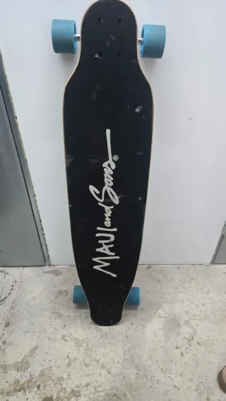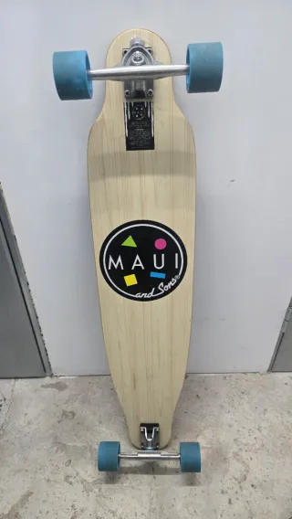Longboard de madera con diseño Maui and Sons. - Tabla de madera clara. - Ruedas color azul. - Logo circular Maui and Sons.