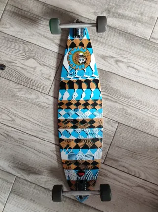 Longboard de la marca Santa Cruz con un diseño clásico y llamativo. Ideal para paseos y carving. - Ruedas cambiadas de 6.5mm. - Diseño con franjas azules sobre fondo de madera. - Muy poco uso.