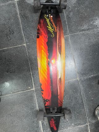 Longboard Mindless Hunter de 115 cm, ideal para paseos y carving. - Tabla de madera con diseño a rayas. - Tiene una rueda para cambiar. -Tiene una pequeña picada en la punta. - Ejes metálicos.