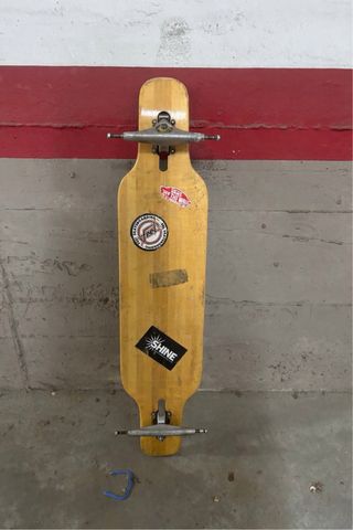 Longboard Flying Wheels de 110 cm en excelente estado. Es un modelo tipo Pintail, con tabla amplia y estable, perfecto tanto para quienes quieren empezar con total seguridad como para quienes buscan una tabla cómoda para pasear (cruising) y dar giros amplios (carving). Especificaciones técnicas: Medidas: 110 cm de largo x 25 cm de ancho (43 pulgadas). Tabla: Madera de arce de alta calidad con un diseño gráfico muy cuidado. Ruedas: Flying Wheels de 70mm y dureza 78A. Lija: original, con buen agarre. Muy bien conservada, sólo con marcas lógicas del uso. Los ejes y rodamientos van perfectos. Las ruedas apenas tienen desgaste.