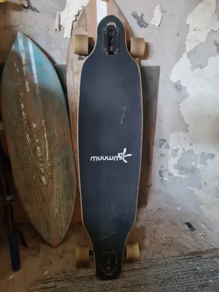 Longboard eléctrico con ruedas todoterreno, ideal para superficies irregulares. No e instalado ni las sujecciones las entrego nuevas y su mando nuevo - Tabla larga y resistente. - Ruedas de gran tamaño con buen agarre. - Doble motor para mayor potencia.