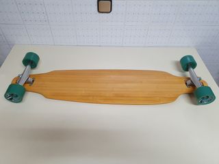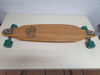 Longboard de bambú con un diseño alargado y elegante. - Tabla de bambú. - Ruedas de color verde. - Ejes metálicos. Se acepta cambio por surfboard