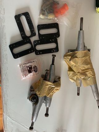 Pack de componentes para skate. Poco uso o ninguno. No envío medidas porque ha está empaquetado. - Dos ejes de skate/longboard. - Cuatro risers (elevadores de eje) negros. - Un set de bussings Miller extra soft.