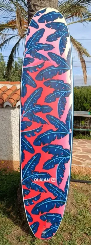 Tabla de surf tipo longboard de la marca OLAIAN. Usada solo una vez. Viene con leash+ quillas Olaian incluidas. - Color azul. - Diseño con asa central. - Incluye información de medidas en la parte inferior.