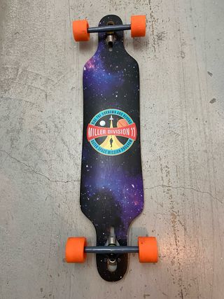 Longboard Miller División 11 con diseño espacial. - Ruedas de color naranja. - Gráficos de galaxia y temática espacial.