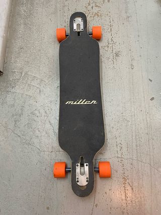 Longboard de la marca Miller, con un diseño lleno de efecto pegatinas . - Tabla de longboard. - Ruedas amarillas. - Ejes de longboard.