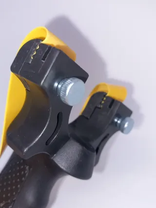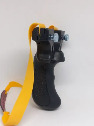 Resortera de color negro de ABS resistente con empuñadura ergonómica y mecanismo de sujeción de goma con tornillos. Trae 2 gomas y accesorios extra. Más en mi perfil.