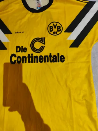 Camiseta de fútbol retro del Borussia Dortmund. - Color amarillo. - Diseño clásico con detalles en negro y blanco en las mangas. - Logo de Adidas y escudo del BVB. - Patrocinador 'Die Continentale'.