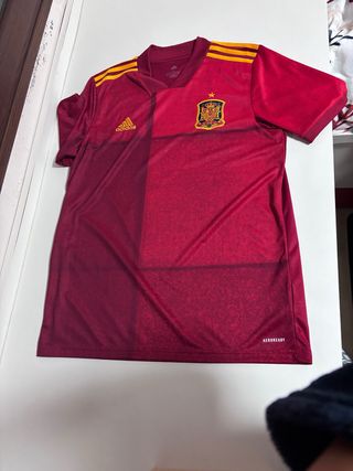 Equipación oficial de la selección española de fútbol. ✅ Talla: L ✅ Estado: Practicamente nueva, usada 2 o 3 veces. ✅ Motivo de venta: falta de uso. ✅ 100% original, comprada en tienda Adidas. - Diseño con los colores característicos de la selección. - Logo de Adidas en dorado. - Escudo de la RFEF bordado. - Tecnología Aeroready para mayor transpirabilidad.