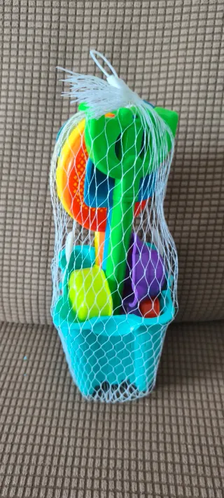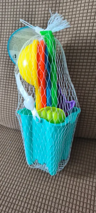 Set de juguetes para la playa, perfecto para construir castillos y jugar en la arena. Incluye un cubo y varias herramientas. - Cubo de color turquesa. - Accesorios de colores variados: verde, naranja, morado y amarillo. - Incluye palas y moldes.
