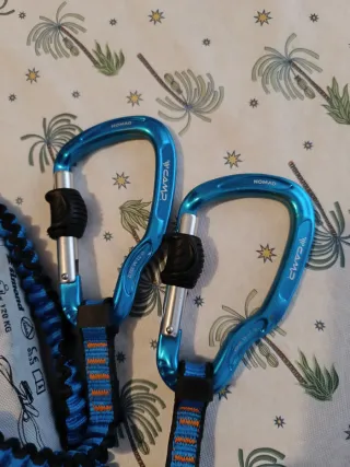 Disipador para vía ferrata con mosquetones. - Mosquetones marca Camp - Poco uso - Mosquetones de seguridad. - Cinta elástica de conexión.