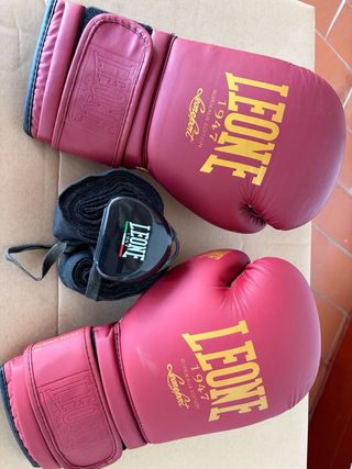 Set de boxeo Leone en color burdeos, edición especial. - Guantes de boxeo Leone 10 oz. - Vendajes de mano. - Bucal Leone.